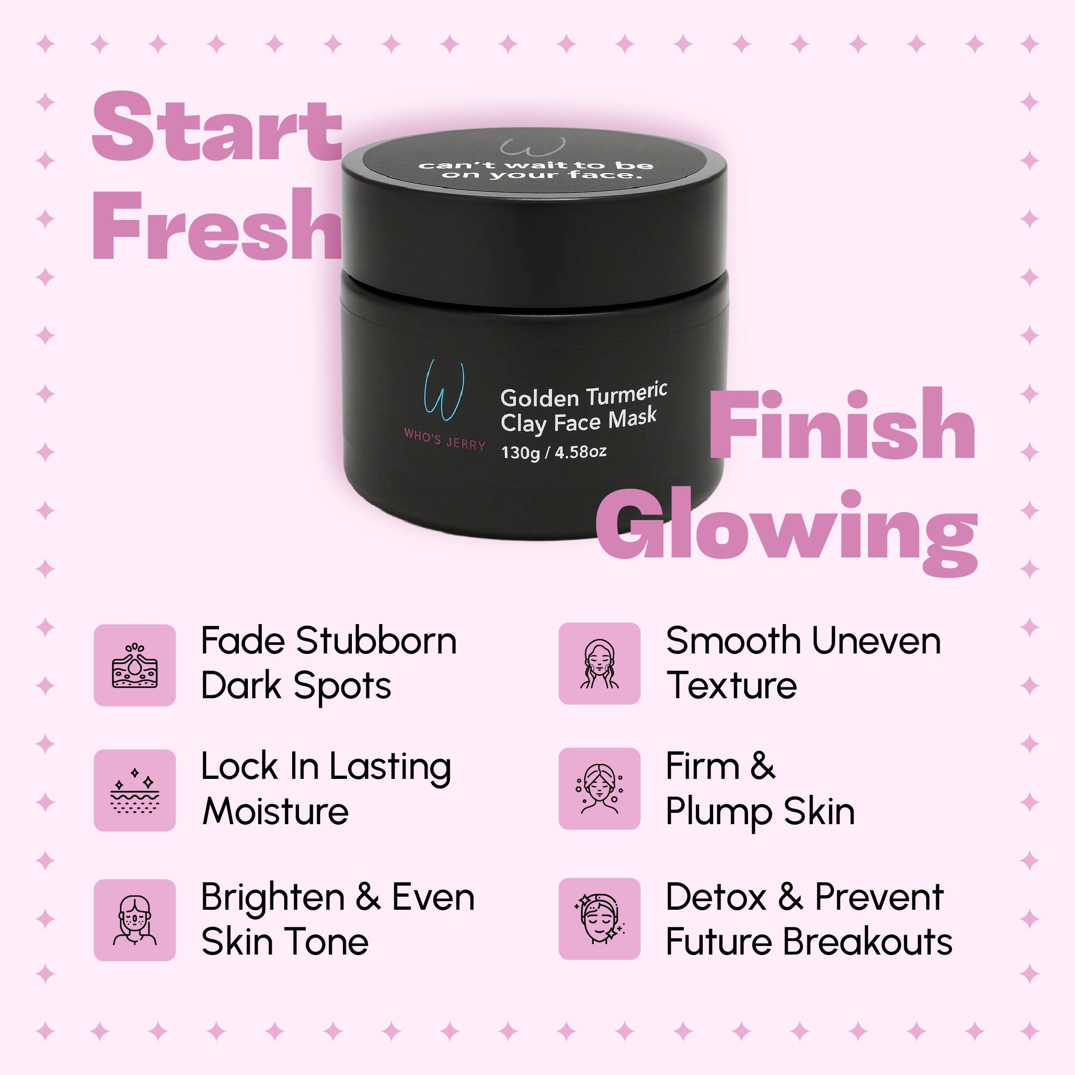 Five stars! This product has truly impressed me. I recently tried Who's Jerry Golden turmeric clay face mask and im thrilled with the results! Not only does it give my skin a beautiful glow but it also helps with anti-pigmentation.